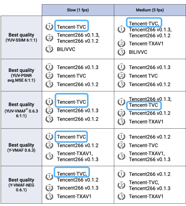 其中,Tencent266在全场各类编码器总计15项指标中取得12项第一,第一总数最多。首次参赛的Tencent-TVC编码器在压缩率最高的1fps速度档位表现优异,所有5项指标取得4项第一。