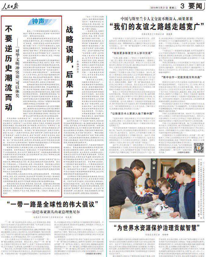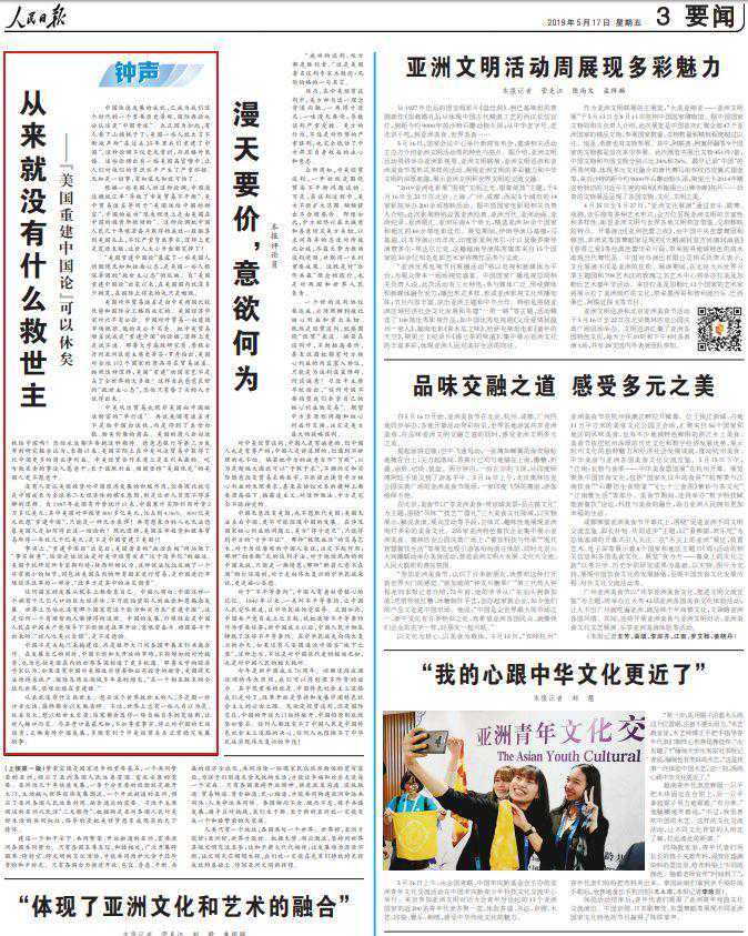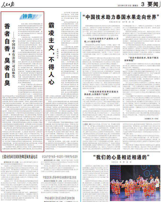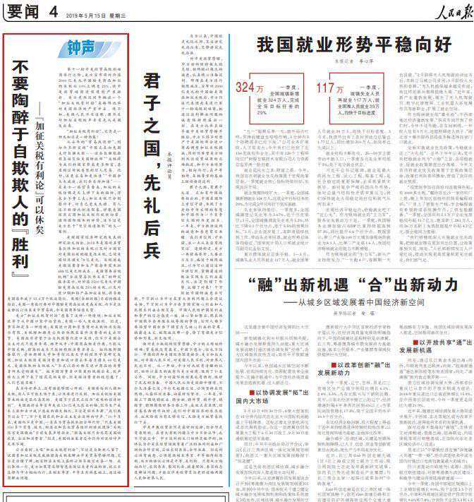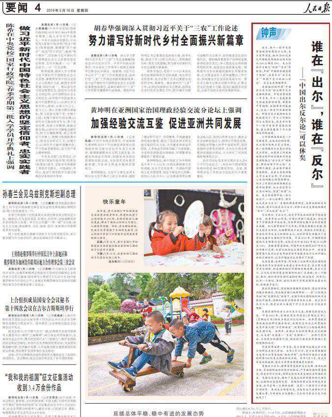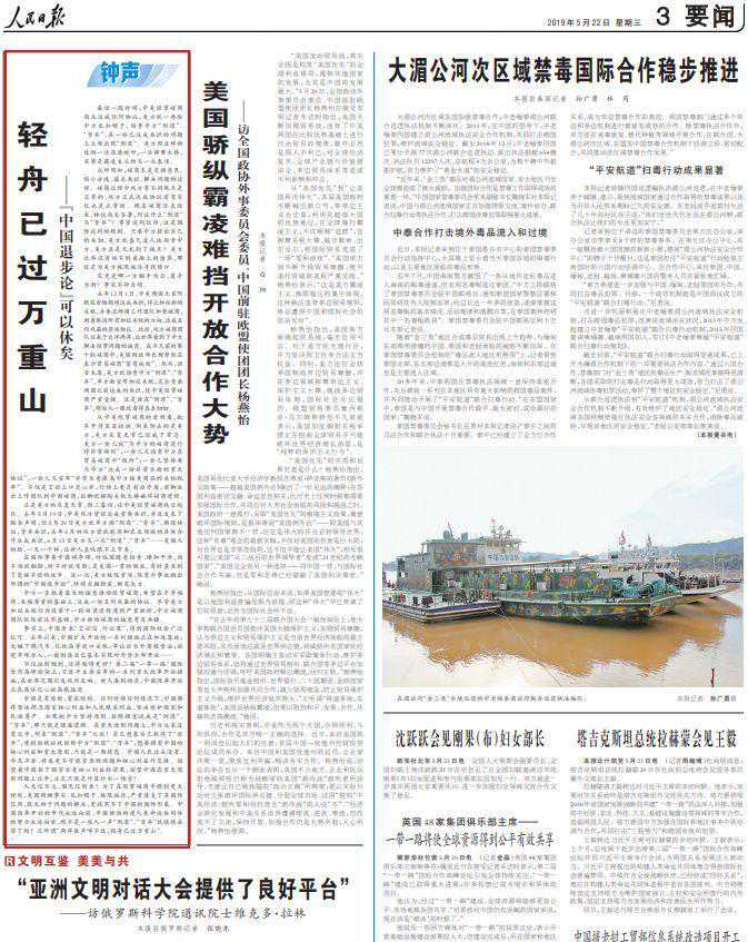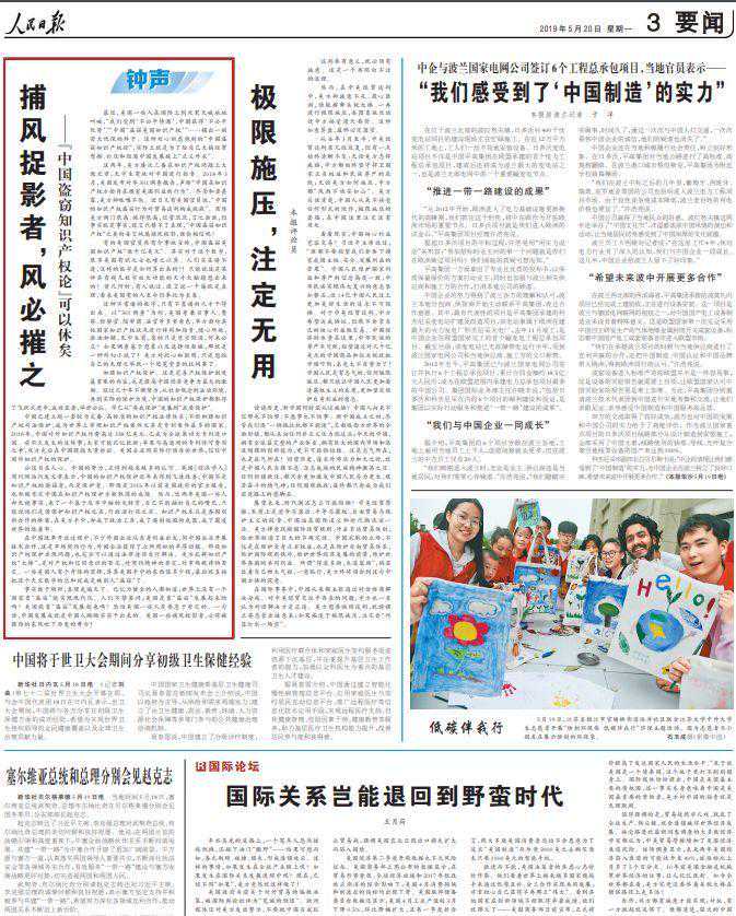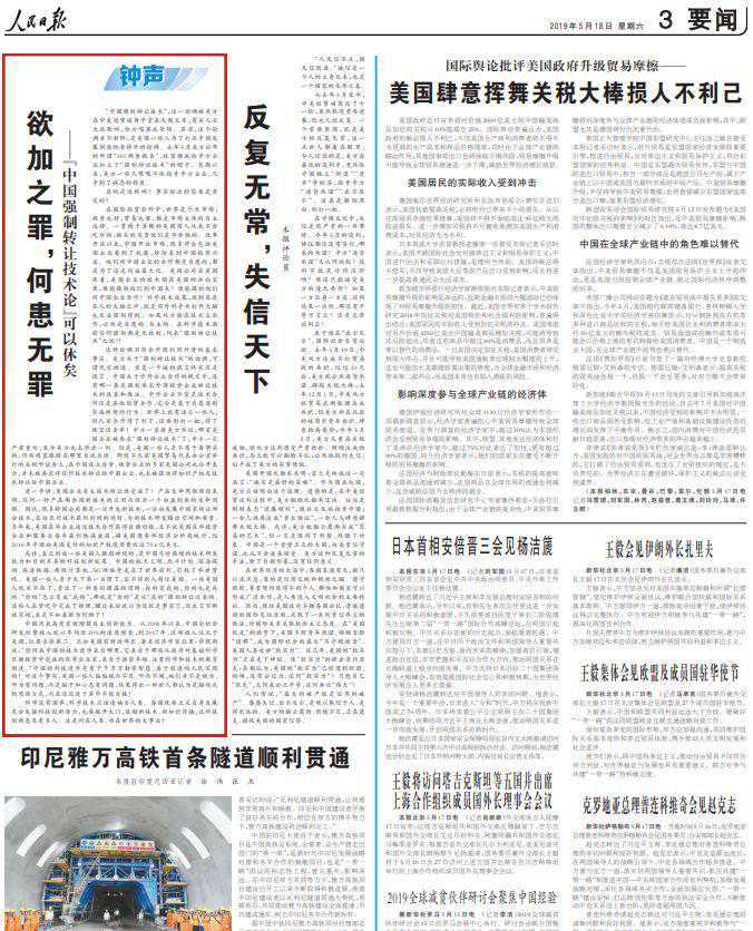 5月14日至22日,《》连发九篇“钟声”文章,针对“美国吃亏论”“加征关税有利论”“中国出尔反尔论”“美国重建中国论”“中国强制转让技术论”“中国技术有害论”“中国盗窃知识产权论”“对华文明冲突论”“中国退步论”等错误论调予以全面驳斥。