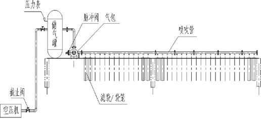 (2)气体进入喷吹管后高速射流,瞬间抵达尾部,在气流从气箱流向喷吹管尾部的整个过程中受压缩反冲膨胀后,逐渐将动能转变为压力能,膨胀气体由喷嘴高速射出,诱导周围空气形成射流气流到达滤袋,在滤袋内形成径向反吹气流进行清灰。