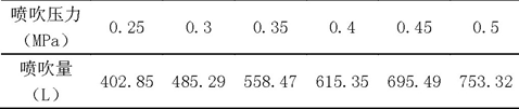 下面以某品牌4寸脉冲阀,喷吹管直径为φ114mm条件下,在脉冲阀导通时间设定为150ms时为例进行实验,其他参数条件不变的情况下,测量了喷吹压力0.25~0.5MPa区间脉冲阀喷吹所消耗的压缩空气体积,实验得出:喷吹量与喷吹压力呈线性关系,具体数值见表格1。