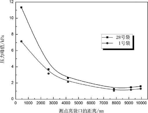 1号滤袋到28号滤袋分别在如图4所示的离滤袋口455mm、2615mm、4165mm、7815mm、9165mm、9945mm位置布置测试点安装压力传感器。实验得出:压力峰值的最大值都出现在第1个测点处(距滤袋口455mm),压力峰值的最小值都出现在第4个测点处(距滤袋口7815mm);从第1个测点到第4个测点,压力峰值逐渐减小,从第4个测点到第6个测点,压力峰值逐渐增大,因此从滤袋口至下,压力越来越小,直到底部,气体积压,压力略微上升。28个滤袋上形成的压力分布整体趋势基本是一致的,从第1号滤袋至第28号滤袋压力值有增大趋势,图5为1号、28号滤袋压力分布曲线对比图,这和喷吹管上压力分布沿气流方向逐渐增大的趋势是一致的。