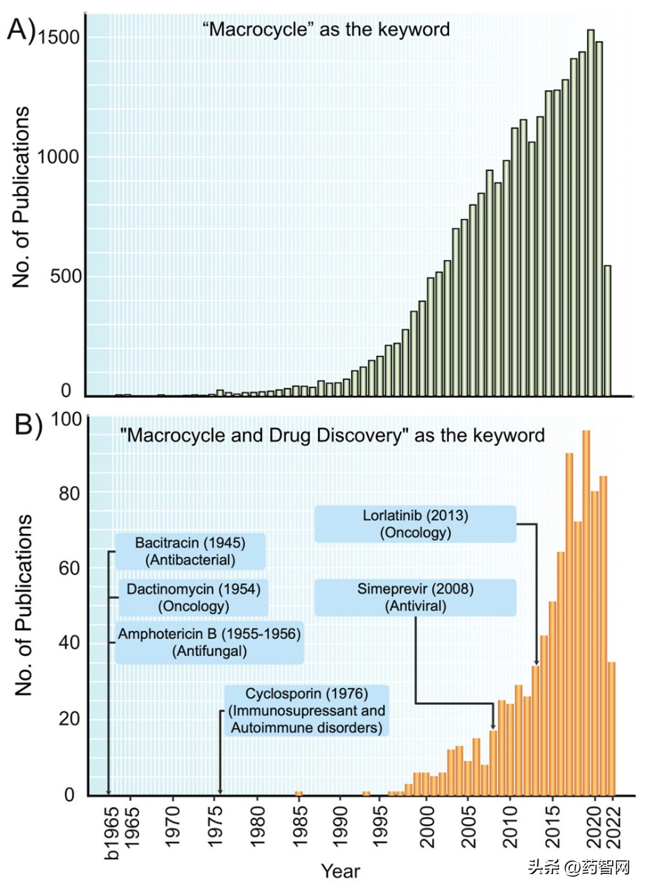 大环通常定义为含有至少12个重原子(重原子指的是除H之外的原子)的闭环有机分子。1970年代末,不同科学领域对大环化合物的普遍兴趣开始增长,并从1990年代开始激增(图1)。在药物发现领域,快速增长阶段始于世纪之交(图1)。