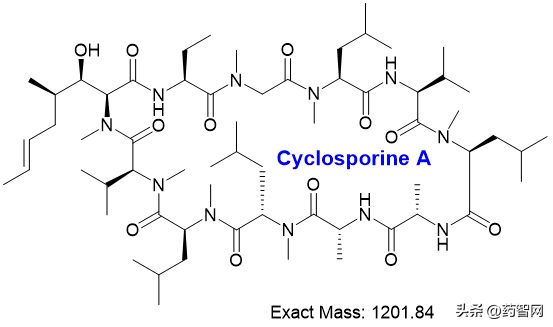 分子量高达1202Da.的环孢素(CyclosporineA,图2)是第一款多肽口服制剂。从历史上看,大环药物大多是自然化合物(例如环孢素),但从头设计的大环药物现在也逐渐大量获得监管审批。