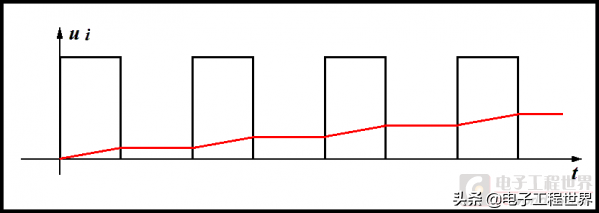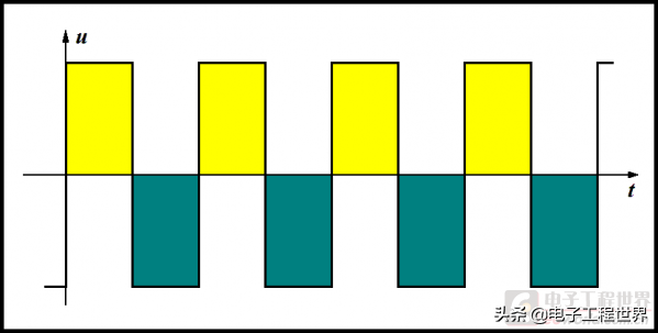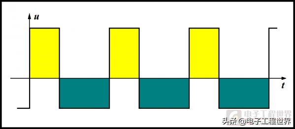 图(08)就是对称矩形波电压对时间的积分图像。图中黄色部分的面积必定与绿色部分的面积相等。
