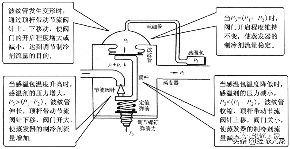 1)内平衡式热力膨胀阀可以通过调整调节螺钉,改变弹簧压力P2的大小,从而改变系统制冷量。它适用于蒸发器流程短、流动阻力比较小的空调器。