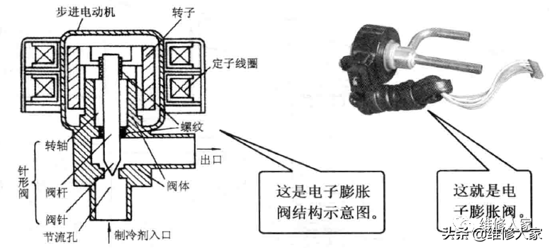 目前新型节能变频空调器制冷系统釆用的是单片机控制的快速动作型电子膨胀阀,它能更精确、高速、大幅度地调节制冷系统负荷。电子膨胀阀主要由步进电动机和针形阀组成。针形阀又由阀杆、阀针和节流孔组成。阀体与阀杆通过内螺纹相啮合。步进电动机运转时,转轴旋转,阀杆在内螺纹的推动下上下移动,改变针形阀的开启程度,从而调节制冷剂的流量。