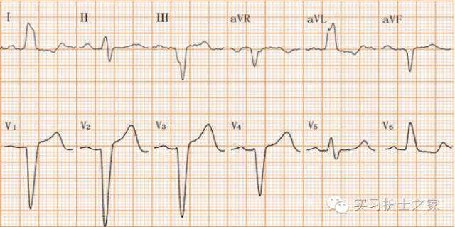 V1呈RSR'型,R'R,QRS时限0.12秒,V5,V6,I,AVL导联呈qrS型,S宽大,ST-T继发性改变。