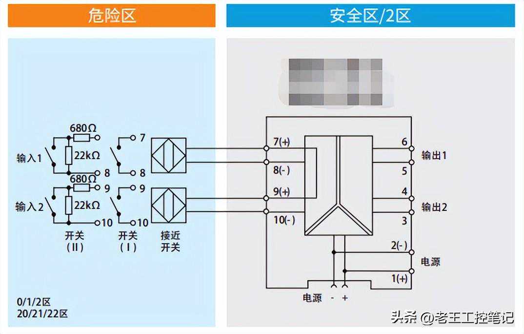 安全栅会向传感器提供8VDC电源,并检测其电流信号。检测点一般为le;2mA和ge;1mA时,安全栅将开关信号转换为继电器信号、有源或无源0-24V晶体管开关信号,从而转换给控制系统。