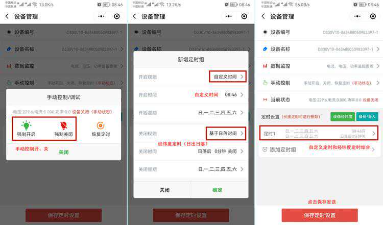 备注:路灯控制开关设置自动定时开关,可以自定义定时(19点开、7点关)、经纬度定时(日落前后开、日出前后关)、自定义定时和经纬度定时结合(日落前后开、12点关,4点开、日出前后关)。