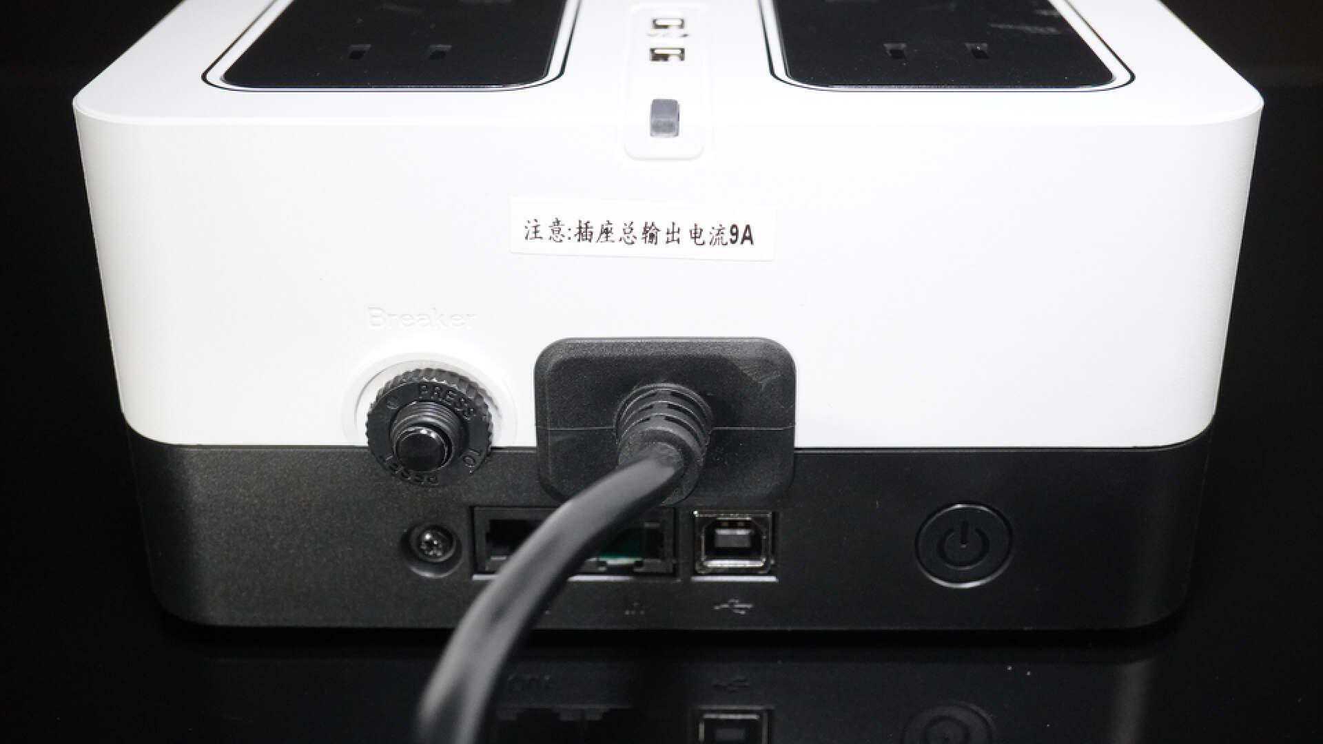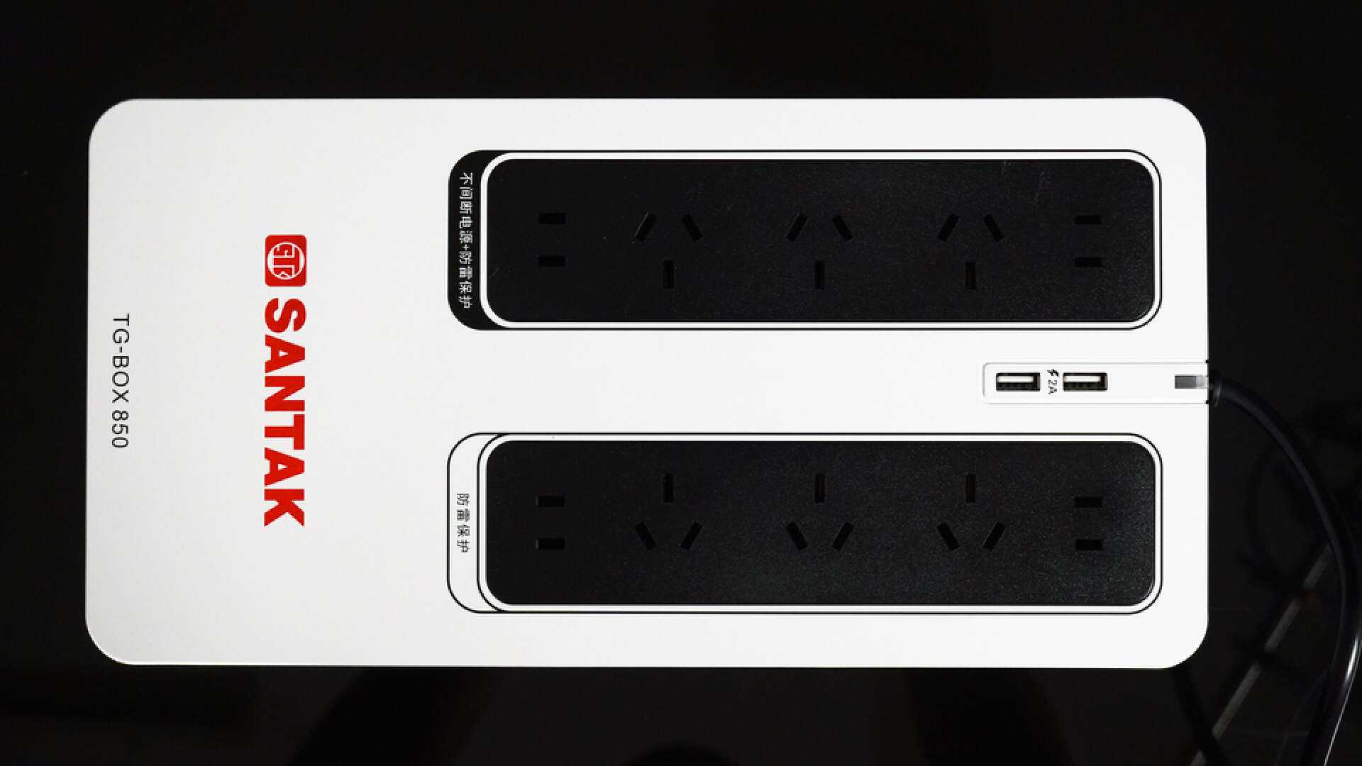 但话说回来,快递运输的时候是什么情况,咱也不知道,所谓的易碎或者正面向上可能也只是说说吧。最近新出的几款家庭NAS,比如极空间和绿联的,都支持山特TG-BOX600/850,主要还是防止断电损坏硬盘。UPS分两列,其中一列是防断电保护,另一排只有防雷保护,3个3脚,2个2脚,理论上可以插五个设备,不过间距较近,并且都只有扁脚插口,实际上能插几个就得看插头了。另外还给了2个2A的USB充电口,聊胜于无吧。