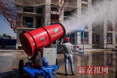 新京报快讯(记者李婷婷)5月10日上午10时许,北京市朝阳区东坝一处施工现场,2台设备同时喷水,施工中的建筑物被一层水雾笼罩,空气很快变得干净湿润,没有了以往常见的尘土飞扬。
