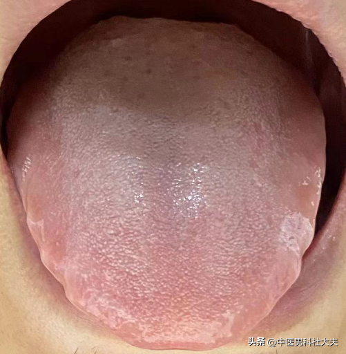 整体来看舌苔的颜色比较淡,舌体胖大犹如啤酒瓶盖子。尤其舌根的部位凹陷的比较厉害。舌苔白腻,沟痕深。经过辨证为:肾精亏虚,宗筋失去濡养,调以大补肾精濡养宗筋。可用阳起石为君,山药,山萸肉,熟地,茯苓,泽泻,丹皮,川牛膝,仙灵脾,菟丝子,覆盆子,木香。嘱咐其平时坚持饮食清淡,甘厚甜食大鱼大肉少吃。一段时间过后精神好转,面色红润,舌苔淡红,脉象有力,宗筋坚韧有时长。