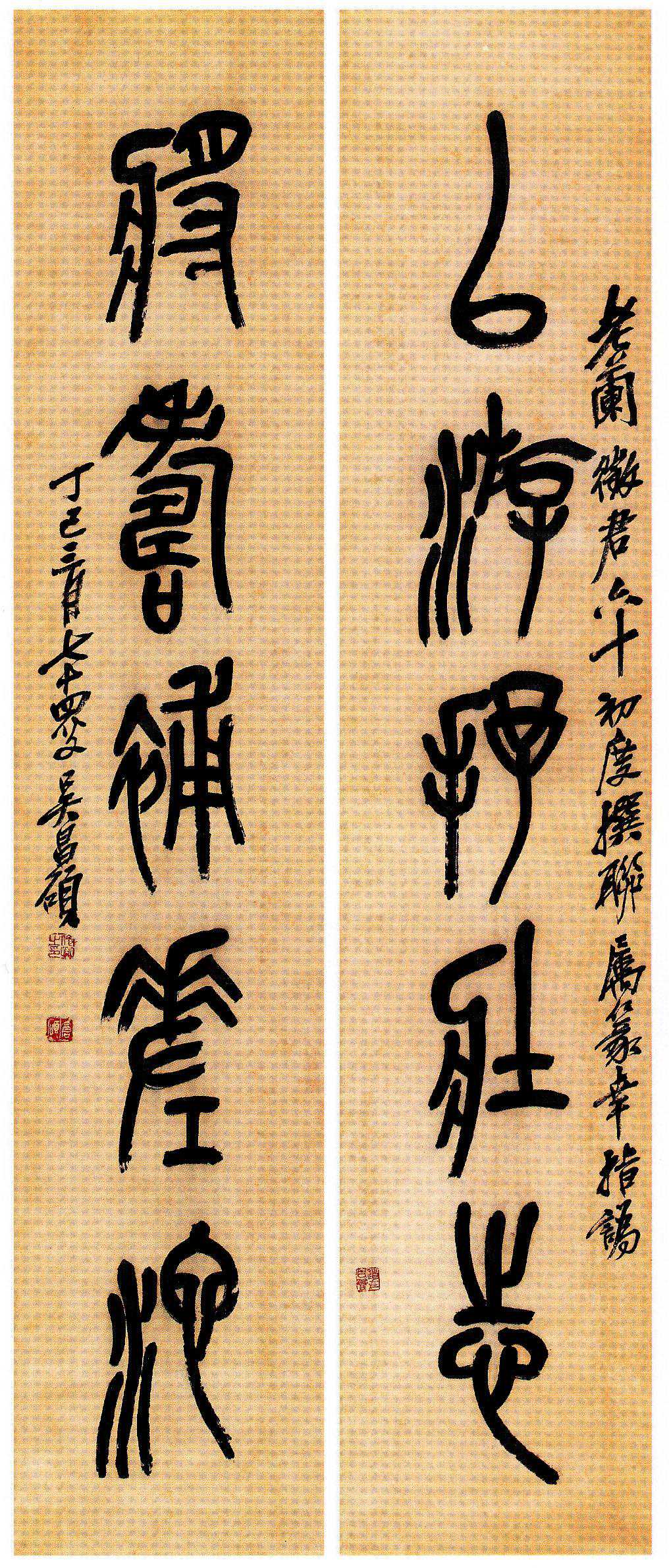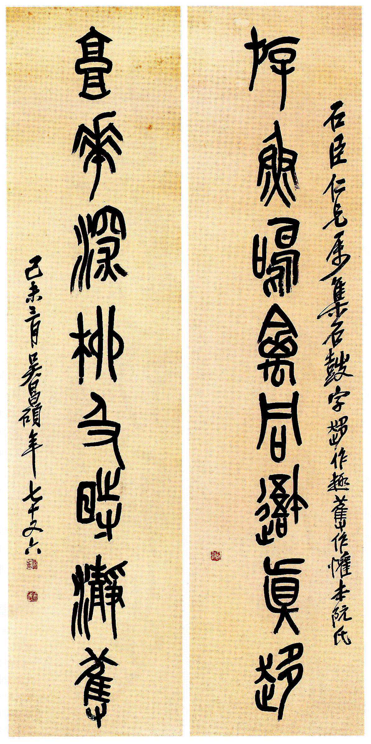 联语以1925年潘天寿拜访海上名家吴昌硕时,吴老书赠潘而著名,实际上吴早年即书此联语。吴氏篆书初学邓石如、赵之谦。按其弟子沙孟海所论,吴昌硕石鼓文大约中年以后结法渐离原刻,六十左右确立自我面目。此联作于54岁,保持着邓、赵风格和石鼓文原作精神,是这一时期力作。
