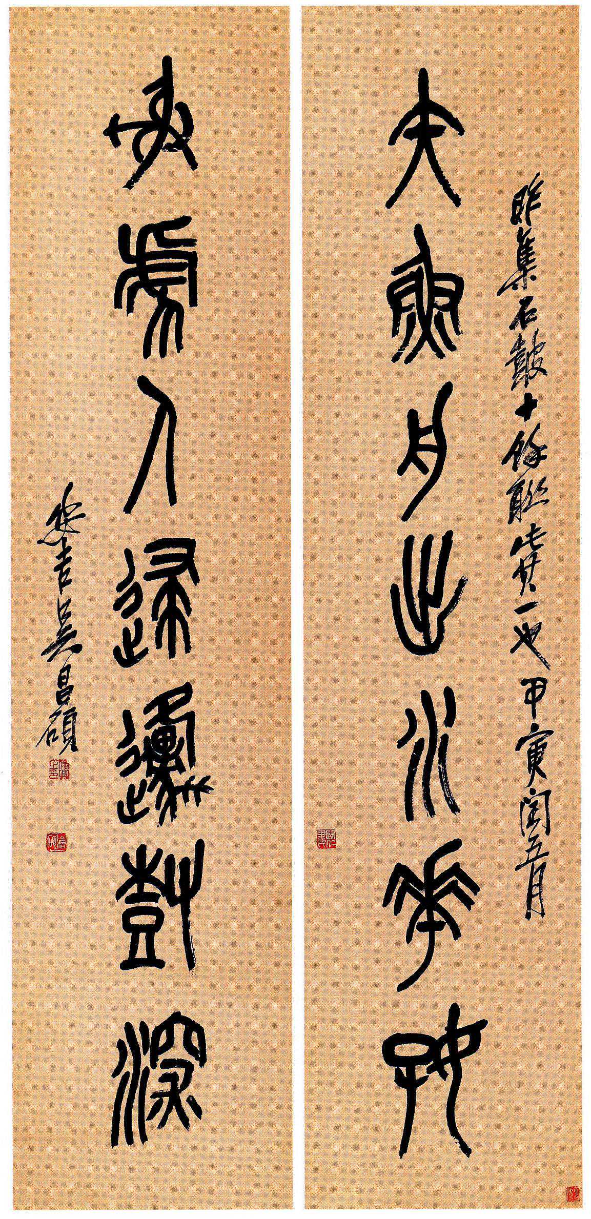 吴昌硕篆书七言联纸本133cm×32.5cm×2甲寅(1914年)作