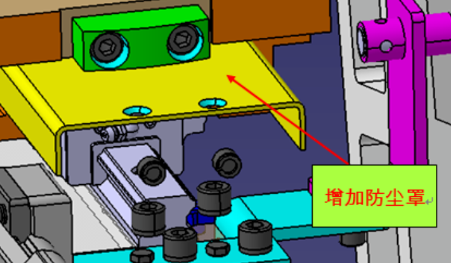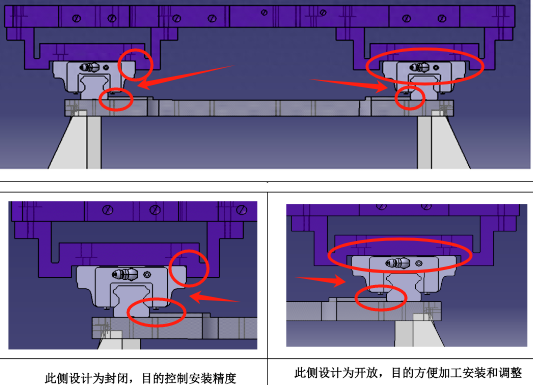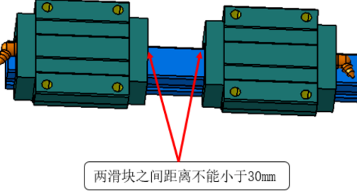 安装导轨的零件上要在其中一根导轨两头打定位销孔;增加滑块限位,防止滑块滑出;