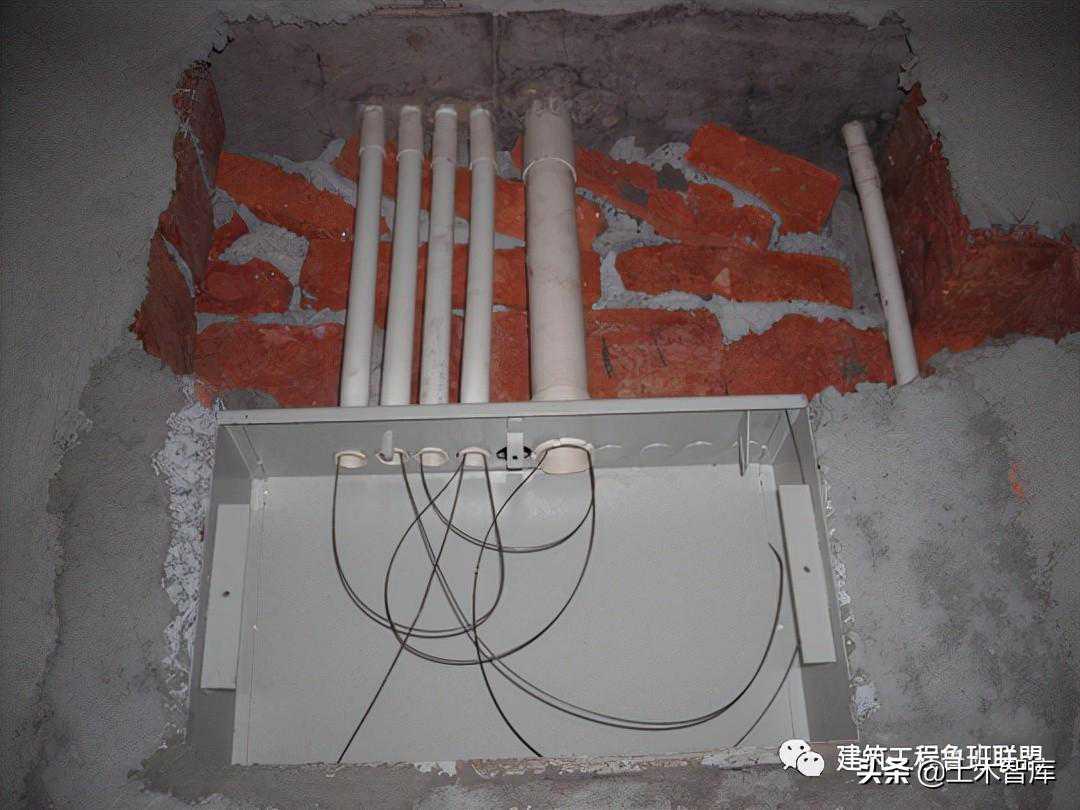 确定开孔位置,并开好孔;固定暗装箱体四角,确保暗装箱体的高度符合要求,并与墙面平正;若箱后仅能抹灰时,总包需在箱后挂钢丝网,再抹灰;若进箱的导管为几根并排暗装进箱时,管槽处也应挂钢丝网,再抹灰。