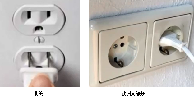 例如,北美洲的插头是这样,但是到了欧洲至少大部地区,它就变成这个样子了。