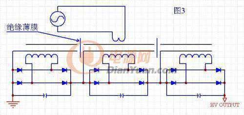 这种方式的电路示意图如图3所示。特点是,磁芯是由多段组合而成,每段磁芯之间都用绝缘性能很好的薄膜进行绝缘。每段磁芯都有一个次级绕组。优点是:适合较大功率的输出。变压器数量少,只需要一副磁芯。每段次级绕组与磁芯的电压差小,次级绕组对磁芯的绝缘容易处理。缺点是:磁芯是分段的,结构复杂。磁芯有气隙,分段越多,等效气隙越大,磁芯固定困难。