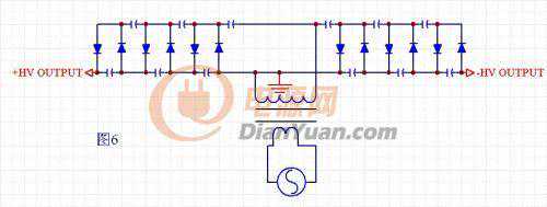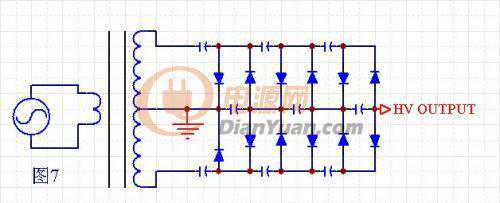 电路结构见图7,这种结构的特点是高压变压器的次级带中间抽头。这种结构的优点是:倍压的电压跌落比半波多倍压方式小很多。纹波也小很多。缺点是:变压器的次级需要抽头,输出同样的高压,变压器的次级匝数增加了一倍。元件多,成本高。