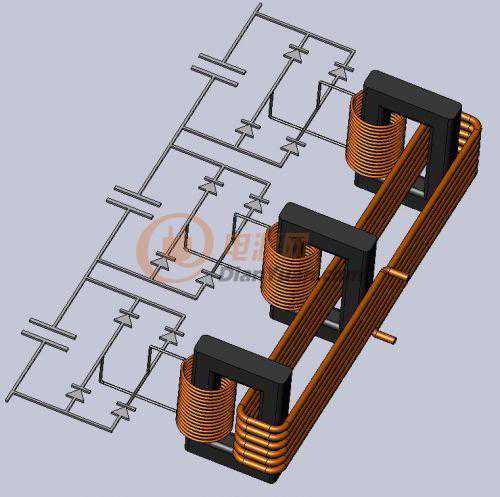 这种方式的电路示意图如图4所示。为了能看的直观一些,这里画了一张3D的图纸,为了画出这个示意图,画了好长时间,特别是初级的那个线圈,看上去简单,很费了一番力气!这种结构的特点是多个变压器组合,初级为串联结构,次级独立整流以后再串联。优点是:适合大功率的输出,变压器的升压比不大。缺点是:初、次级对磁芯之间总有一个绝缘要求高,需要多个变压器。