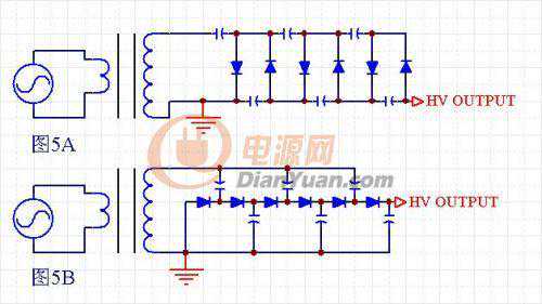 半波多倍压电路有两种结构,一种是图5A的结构,这是基本的也是最常见的倍压整流电路了。这种电路的优点是:结构简单,二极管和电容的电压应力都不高,变压器的输出电压也不算高。缺点是:带负载能力较差,倍压阶数越高则电压跌落越多,最终存在一个极限倍压阶数。超过这个阶数,电压不再升高,反而会下降。另一种是图5B的结构,这种电路的带载能力强一些,但是电容的电压应力很高。