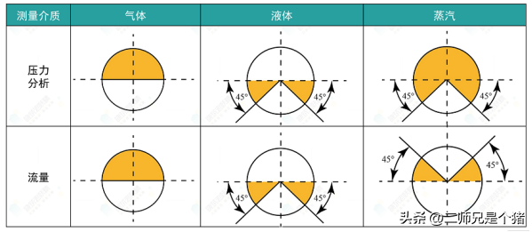 3)测量蒸汽压力时,应在管道的上半部分及管道下半部分与管道水平中心线0-45°角夹范围