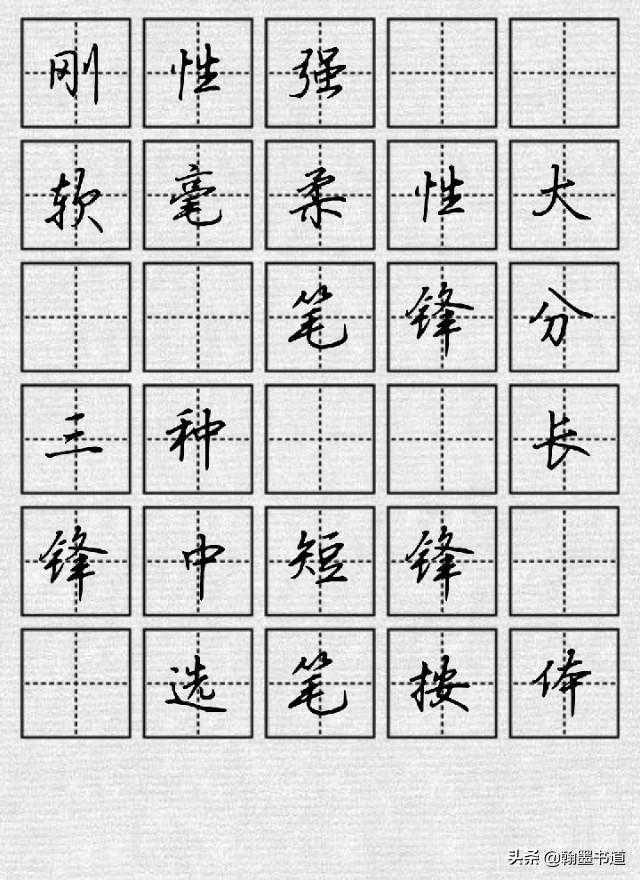 书法之工具首先是毛笔工欲善其事必先利其器毛笔种类多听我给你说鬃毛紫狼笔羊毫猪鼠鬃兔毫和鸡毫胎毛能制笔兽毛有硬软软度不一般硬毫刚性强软毫柔性大笔锋分三种长锋中短锋选笔按体用大致分三类大中小三种还有特号笔圆尖齐健直这是好毛笔新笔开始用先将温水浸