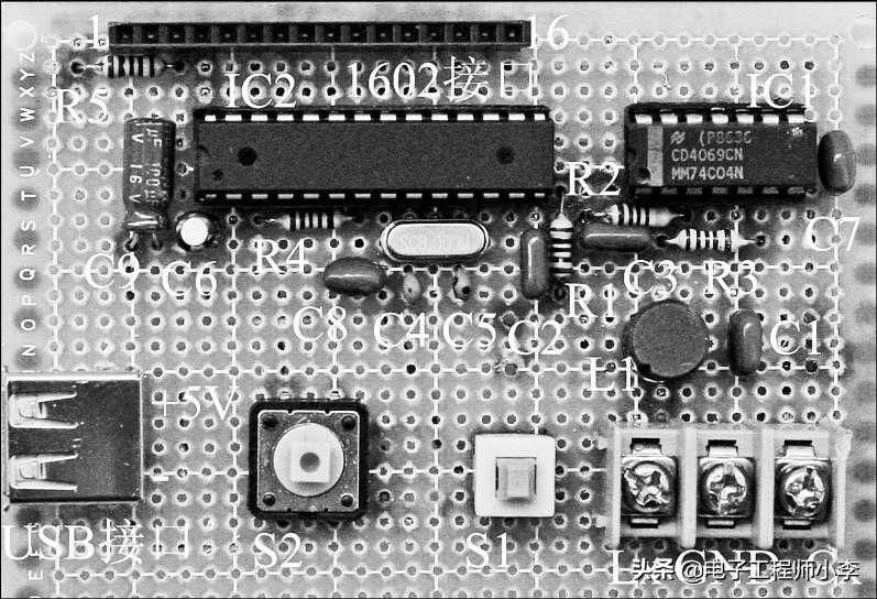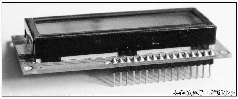 电路板的装配图如图23.4所示。LCD1602的接口排座焊接在电路板上,排针焊接在LCD1602模块上如图23.5所示。