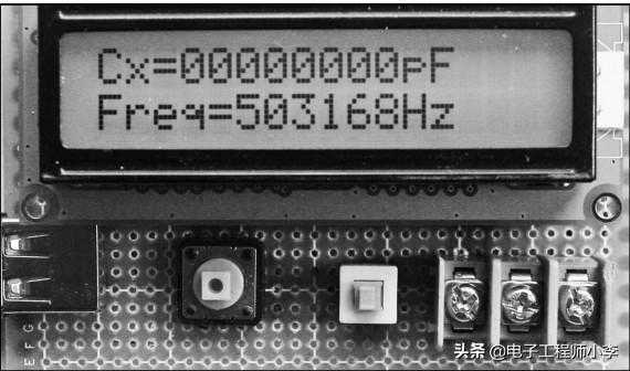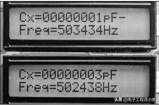 如果使用中发现测量误差较大,可通过程序进行修正,具体做法如下:找一个精度高的1000pF电容进行测量,假设读数为950pF,则计算1000/950≈1.05,我们将其称为修正系数,将计算公式Cx=[(f1/f2)2-1]C1改为Cx=[(f1/f2)2-1]C1×1.05,用这个公式计算就能减小测量误差了。为了简化程序中的计算,我采取把程序中的语句“unsignedintC1=1000”改为“unsignedintC1=1050”的方法,效果是一样的。