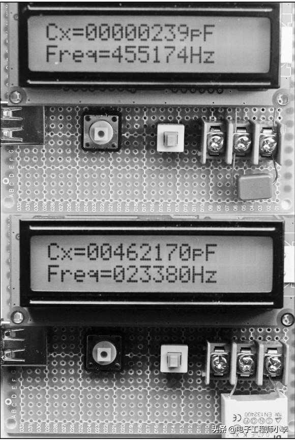 接通电源后,以电容挡为例,虽然我们在测试端并没有接任何电容,但LCD1602第一行显示的电容量读数并不为零,如图23.6所示,我们称其为初始值,这是由基准频率略有漂移造成的。这时如果测量小容量的电容,误差就比较大,当初始值后有“-”号时,测量值是实际值减去了初始值,即读数比实际容量小了。反之,测量值是实际值加上了初始值,即读数比实际容量大了。