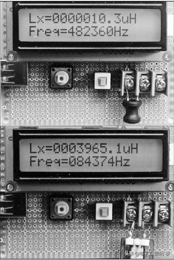 再找一个精度高的100μH电感进行测量,假设读数为94,则计算100/94≈1.06,把程序中的语句“unsignedcharL1=100”改为“unsignedcharL1=106”,同样也能减小测量误差。