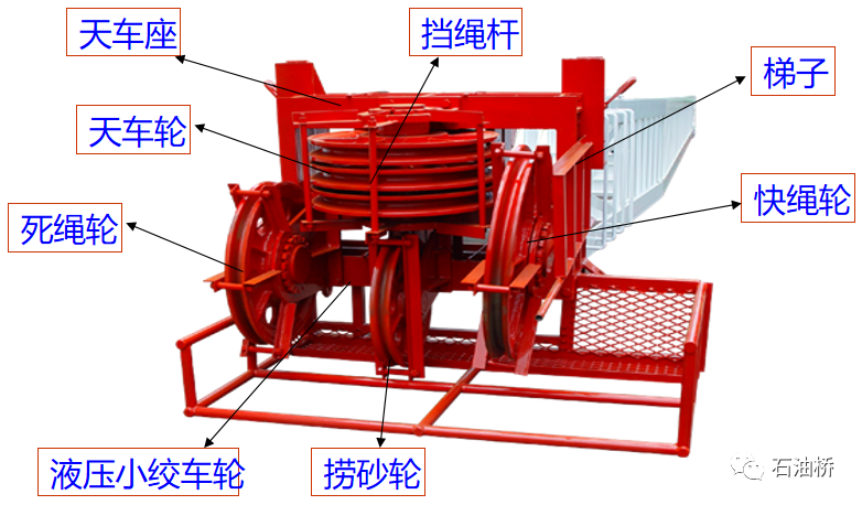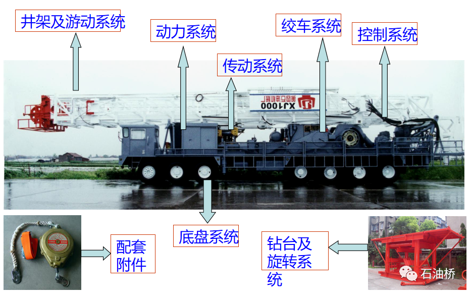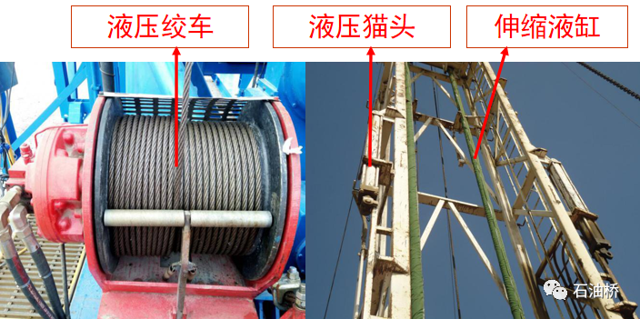 提升系统:悬吊和起下井内管柱。包括井架、绞车系统、钢丝绳、天车、游车大钩、绷绳等。