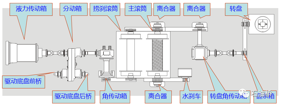 2、发动机—传动箱—传动轴—角传动箱—链条传动—主滚筒—链传动—转盘传动装置—转盘—方补心