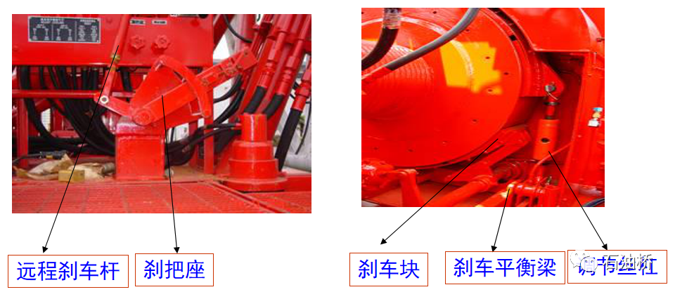 主滚筒刹车系统:钢带、刹带块、平衡梁、曲柄轴、限位圈、调节丝杆、拉杆、刹把。作用:控制主滚筒旋转。