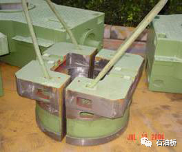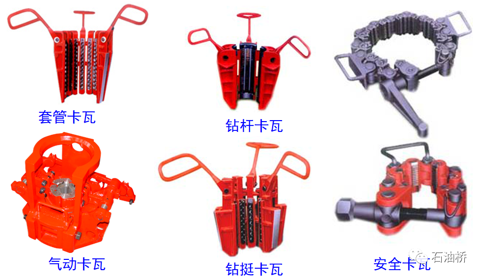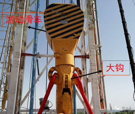 4、游车大钩:游动滑车是一组动滑轮,大钩主钩用于悬挂水龙头,两个侧钩用于悬挂吊环。游车及大钩均为钻修起下钻的重要提升设备,将绞车的旋转动力变为大钩的提升运动。