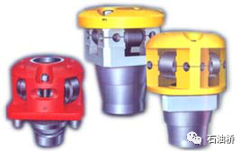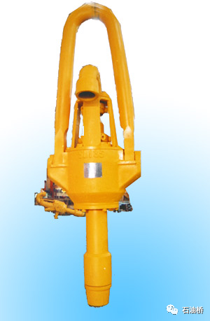 2、水龙头:水龙头主要用于悬持钻柱,同时向钻柱引入高压循环液。由固定和转动两部分组成。即悬挂在大钩上的固定部分和连接方钻杆的转动部分。