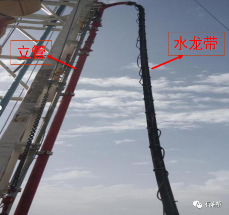3、水龙带、立管:水龙带连接立管和水龙带的高压软管,用于输送进入钻柱内的高压循环液。
