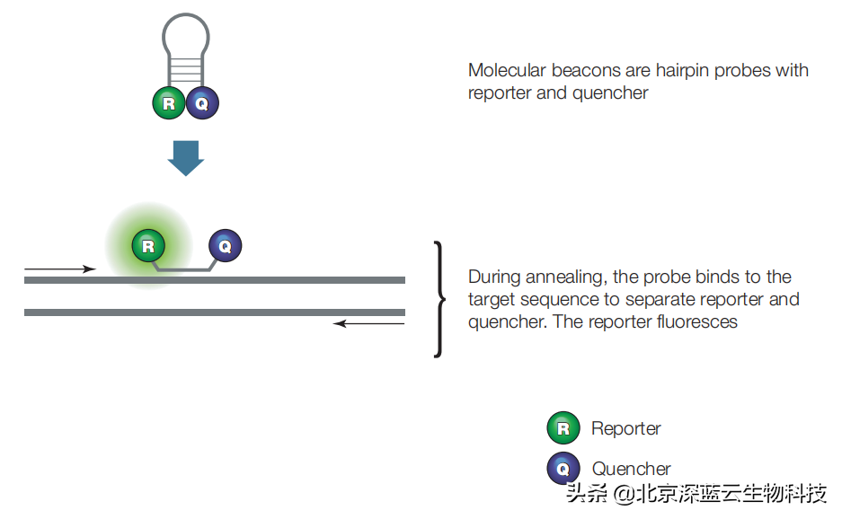 游离状态下,分子信标探针是一种茎环结构,其环状部分的15-30个碱基可以与靶标区域相结合匹配,下端的配对区域(左右一般各5-6个碱基)则由重复的GC组成,从而将5’的荧光分子和3’的淬灭基团紧紧聚在一起,荧光发生淬灭;当退火时,分子信标探针解开环并与模板靶标杂交,这样荧光分子和淬灭基团的物理距离就变大了,荧光淬灭的前提就打破了(图5)。除了MGB探针,分子信标探针也非常适合用于SNP检测。