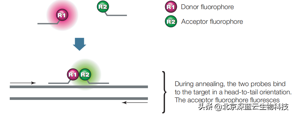 Taqman探针对探针的长度有比较严格的要求,双杂交探针则消除了这一“缺陷”。双杂交探针是由两条寡核苷酸单链组成,一条的3’端带有供体荧光分子,另一条的5’端带有受体荧光分子(图4)。游离状态下荧光供体会发出荧光,但当两条单链都匹配到模板链上时,就会发生荧光共振能量转移FRET,受体荧光分子就可以发出荧光,其荧光强度与生成的产物的量成正比。双杂交探针的优势有两点:摆脱了探针长度的限制,较长的探针可以提高与模板匹配的成功率;只有上下游两条探针都正确匹配后才能检测到受体荧光分子发出的荧光,特异性有所提高。