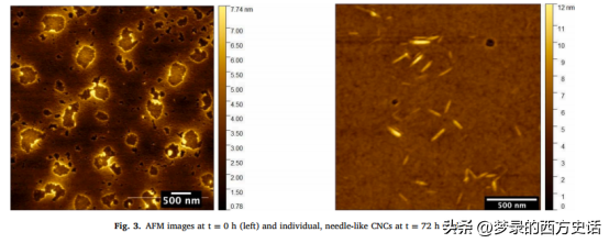 AFM成像的结果与TEM基本一致,既显示了聚集体,也显示了聚集体相同的针状cnc(厚度10.8±4nm)。
