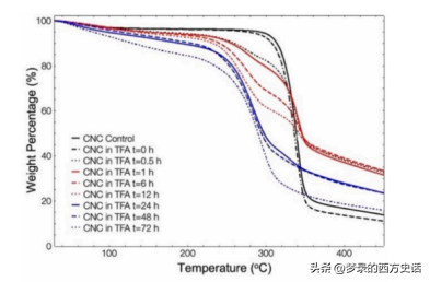 在不同时间点收集的CNC-TFA悬浮液在室温至450°C的氮气下以10°Cmin-1的加热速率表征。