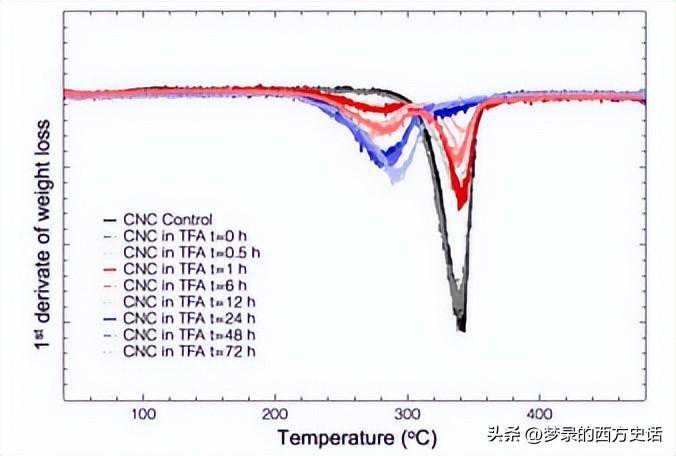 t=0.5、1、6和12h的中间样本似乎包含两个种群的cnc;一种与天然纤维素非常相似,并遵循对照样品的热分解路径,另一种则大致遵循t=48h和72h样品的热分解路径。