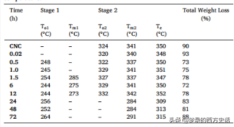0.5h至24h的样品进行了两阶段热分解,而t=48h和72h的样品再次进行了单阶段热分解,但范围更广,中点比原生CNC和t=1min样品低约50°C。