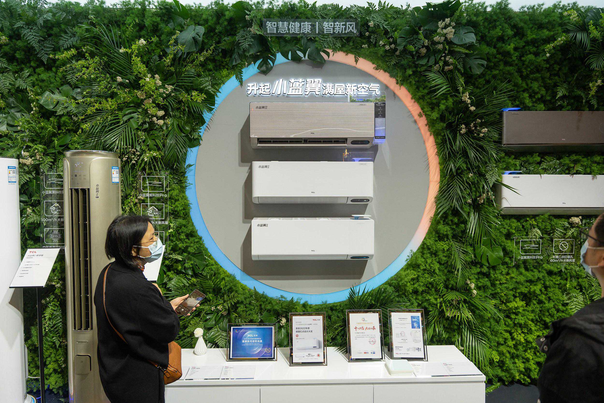 比如今年大空调品牌都在打“新风”牌,TCL的小蓝翼就是本次展会上宣传得最多的一款产品,包括京东的展台都在为它做宣传,能更好的保持室内空气不说,还能让室内形成正压效果,进一步减少外部灰尘的进入,安全又卫生,回头有机会给做一个体验。