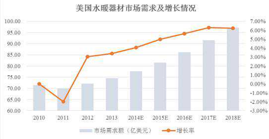 根据根据美国咨询机构GloBAlIndustryAnalysts,Inc.(以下简称“GIA”)2014年5月发布的《PlumbingFittinGSandFixtures》,欧美水暖器材近年增速逐步增加,预计2018年市场容量将达到262.37亿美元左右。主要新兴市场国家水暖器材的需求量也已占到全球市场容量的比重为43.11%。可以看到全球水暖器材需求和企业均稳步提升。