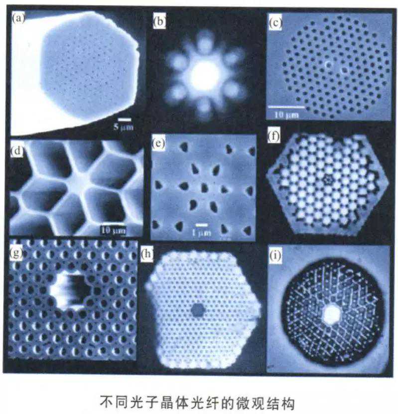 光子晶体的概念最初由雅布罗诺维奇(E.Yablonovitch)于1987年提出,即不同介电常数的介质材料在一维、二维或三维空间内组成具有光波长量级的周期性结构,在此晶体中产生允许光传播的光子导带和禁止光传播的光子带隙(PBG)。通过改变不同介质的排列方式及分布周期,可以引起光子晶体性质上的许多变化,从而实现特定的功能。PCF是二维的光子晶体,又被称为微结构光纤或者多孔光纤。1996年,奈特(J.C.Knight)等人拉制出首根PCF,其导光机制与传统光纤的全内反射导光类似。第一根依靠光子带隙原理导光的PCF诞生于1998年。2005年以后,大模场PCF的设计和制备方法开始多样化,出现了各种形状的结构,包括泄露通道PCF、棒状PCF、大间距PCF以及多芯PCF等。光纤的模场面积也相应不断提高。