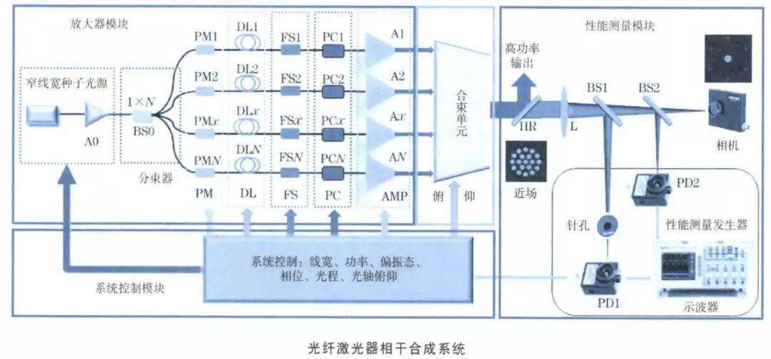 相干合成是通过控制各路激光束的相位、频率、偏振具有一定的一致性,使其满足相干条件,获得同相锁定输出,其可以获得比简单的非相干叠加高得多的峰值强度,并且保持良好的光束质量。相干合成技术的发展历史和激光器本身的历史几乎一样长,而且涉及气体激光器、化学激光器、半导体激光器、固体激光器等各种类型,但是由于早期各种器件的不成熟,相干合成技术取得的实验结果没有突破当时相应单链路激光的最大输出功率,因此效果不甚明显。从1990年代开始,光纤激光器的出现使得相干合成技术获得了突飞猛进的发展。其原因除了光纤激光器本身独特的优势和百千瓦战术使用的需求外,光纤通信商业推广过程中配套产生的几种器件(即光纤熔锥耦合器、多芯光纤、带尾纤的相位调制器与声光移频器等)起到了至关重要的作用。光纤熔锥耦合器、多芯光纤使得基于激光能量注入耦合和倏逝波耦合的被动相位控制十分便利,带尾纤的相位调制器与声光移频器使得主动相位控制能够具备兆赫量级的控制带宽,可以用于控制大功率条件下的相位起伏,实现锁相输出。研究人员提出了许多各具特色的相干合成方案。