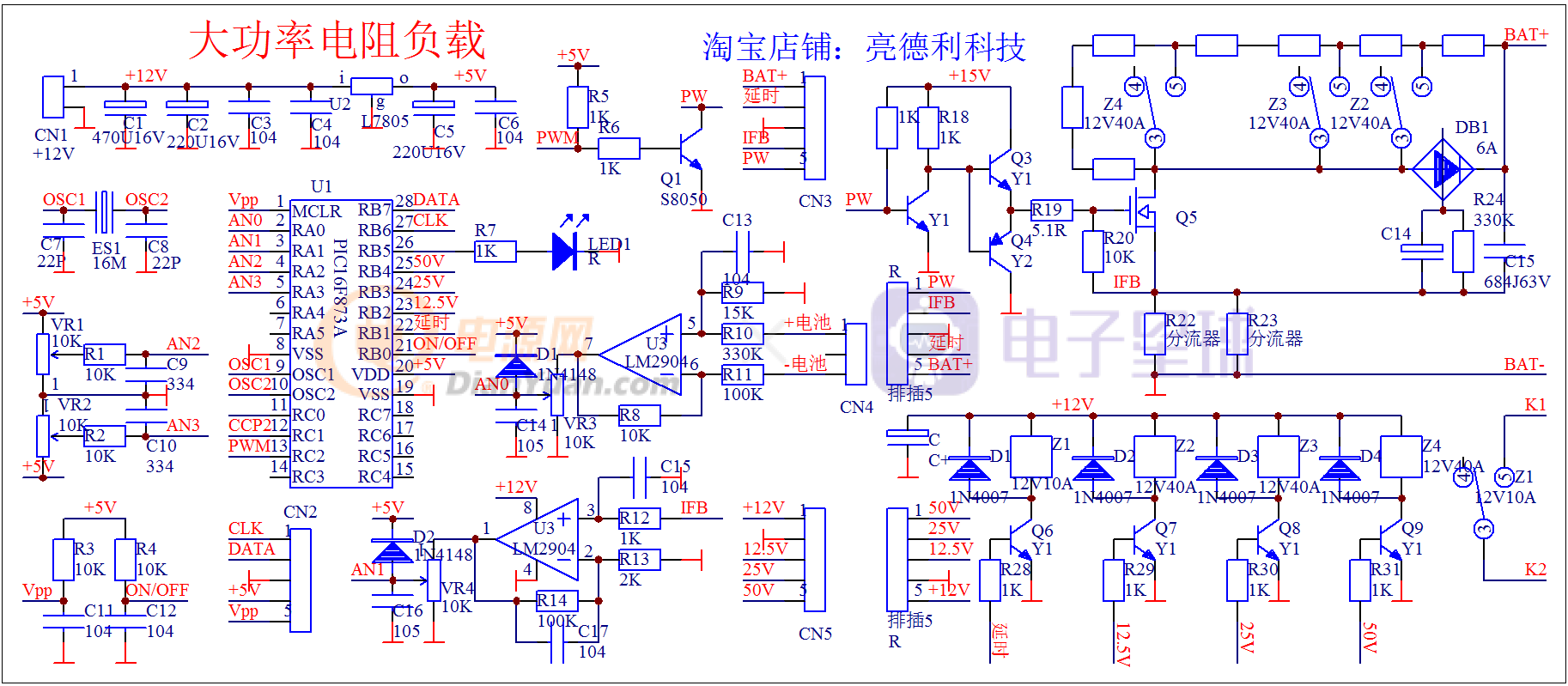 本机工作原理:分段式自动切换,分四档控制,打开点12.5V,25.0V,50.0V100V,关闭点10.5V,22.0V,47.0V,关闭与打开留有间隙,以免继电器在一个控制点不停的开关切换,这是靠检测输入电压,来控制康铜丝的不同的电压匹配不同的电阻,这是初调环节,紧接着就是精密调节,利用用户给定的参数,电压设定和电流设定参数,使用全世界公认的PID算法(稳压,稳流),利用单片机里面的PWM模块1024级的精确控制,从而做到输出值与用户设定值完全相等。