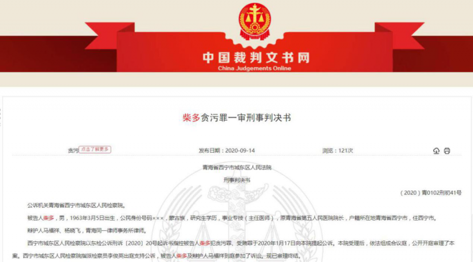 在受贿事实中记载,柴多在2008年10月担任西宁市第一人民医院院长期间,以及2014年6月担任青海省第五人民医院院长期间,飞利浦代理商曾两次向柴多行贿共计20多万元,两次均是由于彩超机调试安装后医院未付款,受贿之后柴多向医院打招呼尽快付款。