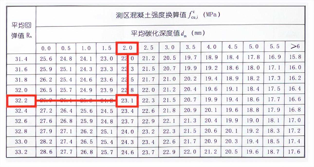 例如下图:测得的平均回弹值为32.2,平均碳化深度值为2.0。根据换算表,可以得出混凝土强度为23.1